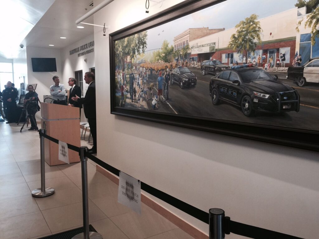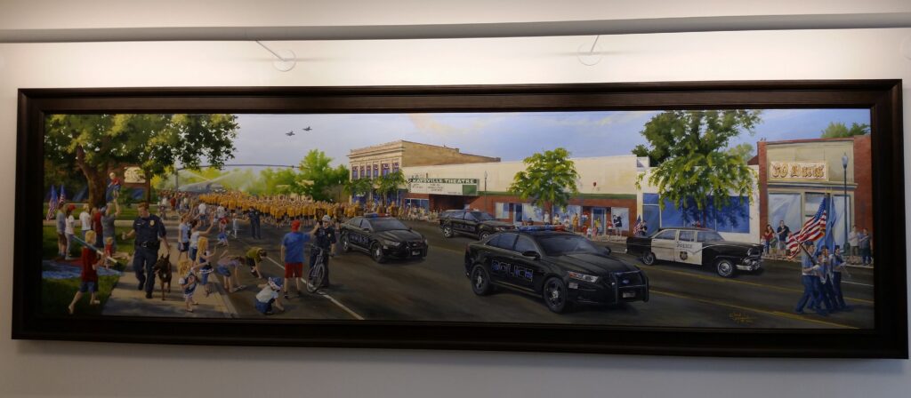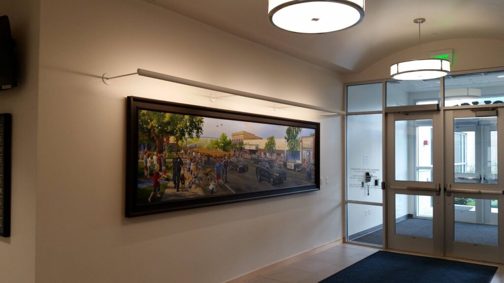 The painting is the work of Chad Hawkins, a highly successful local artist and illustrator. The painting was commissioned by Zion’s Bank and generously donated to Kaysville City in August 2016.